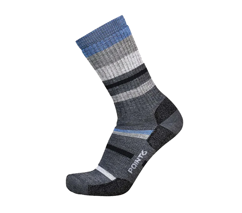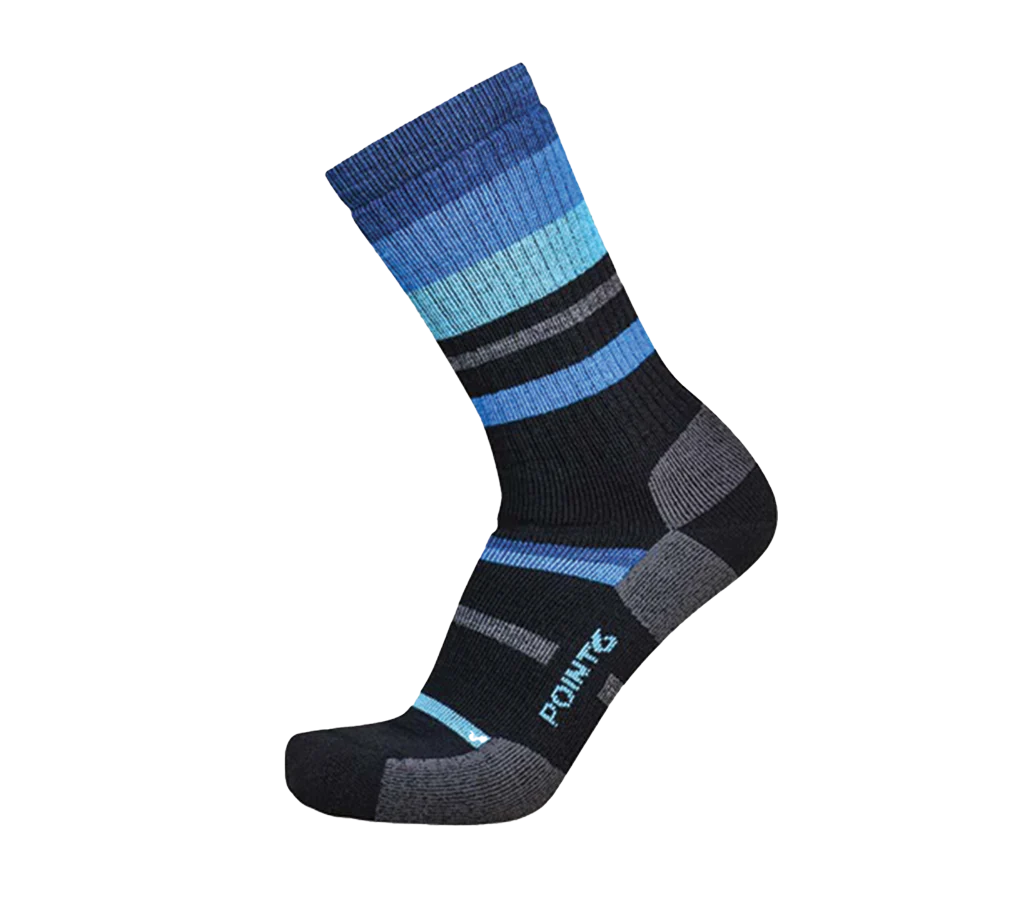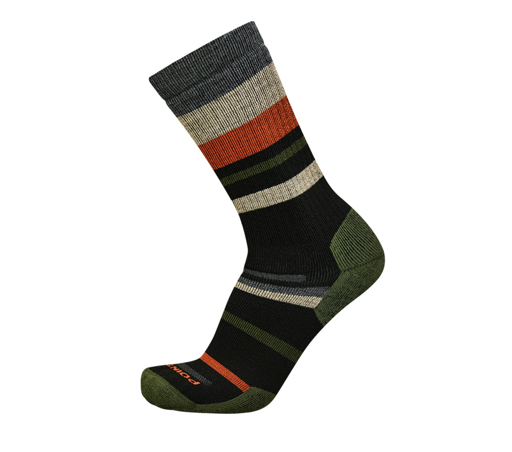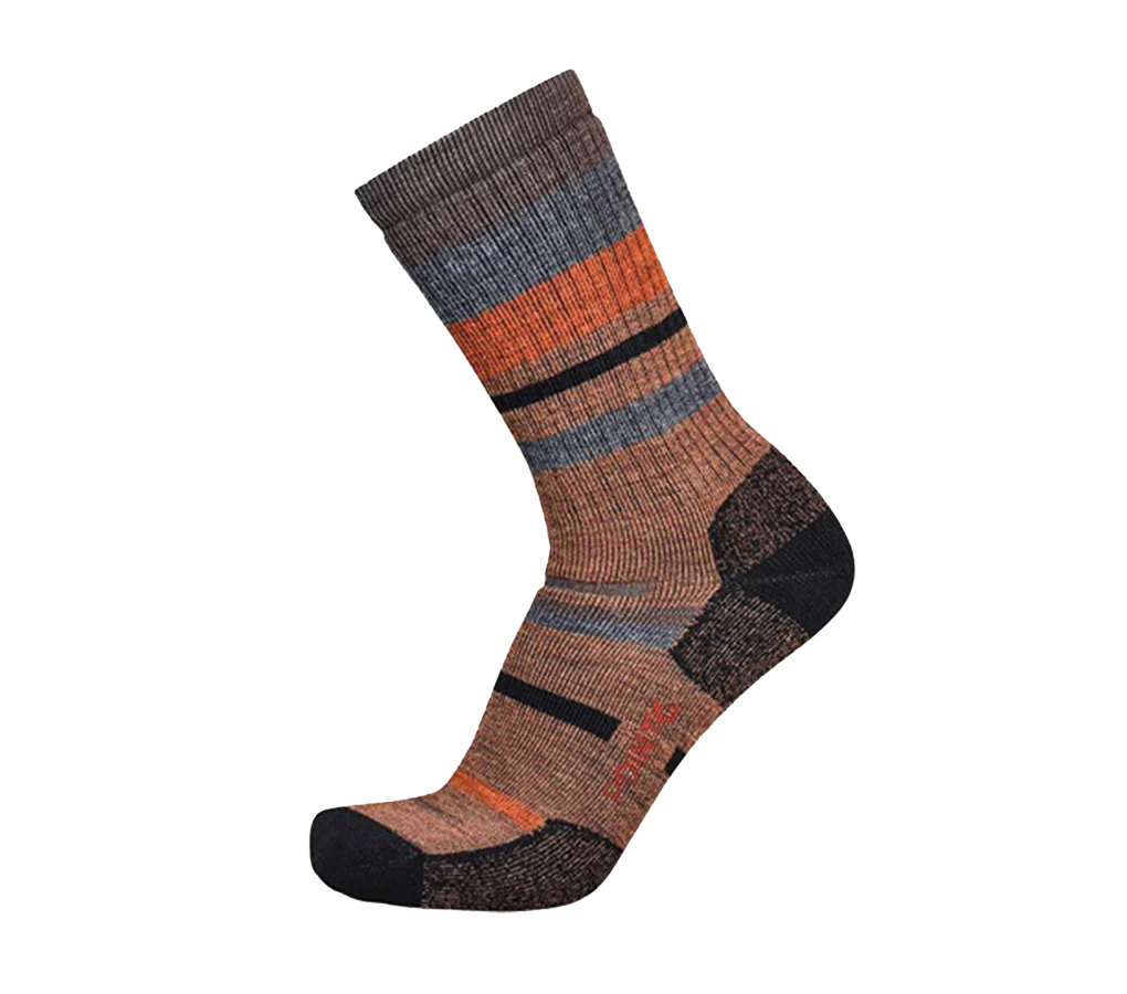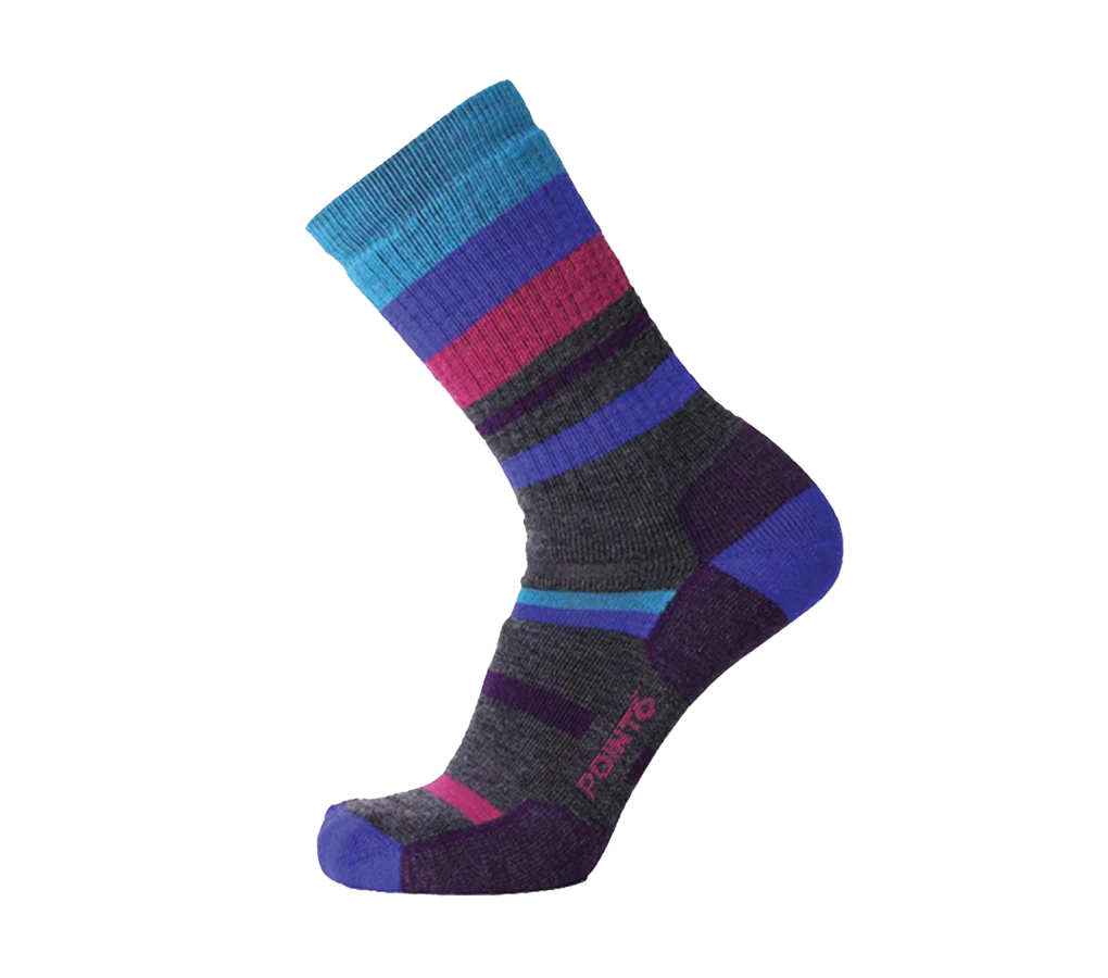 The Mixed Stripe Medium Crew merino wool sock offers extra cushioning on the instep and around the leg to protect against pressure points from heavier footwear. The cozy wool cushioning next to the skin insulates the foot from hot spots and the natural thermoregulating properties keep you warm and dry in all conditions. Perfect for hiking, walking, or long days on your feet.