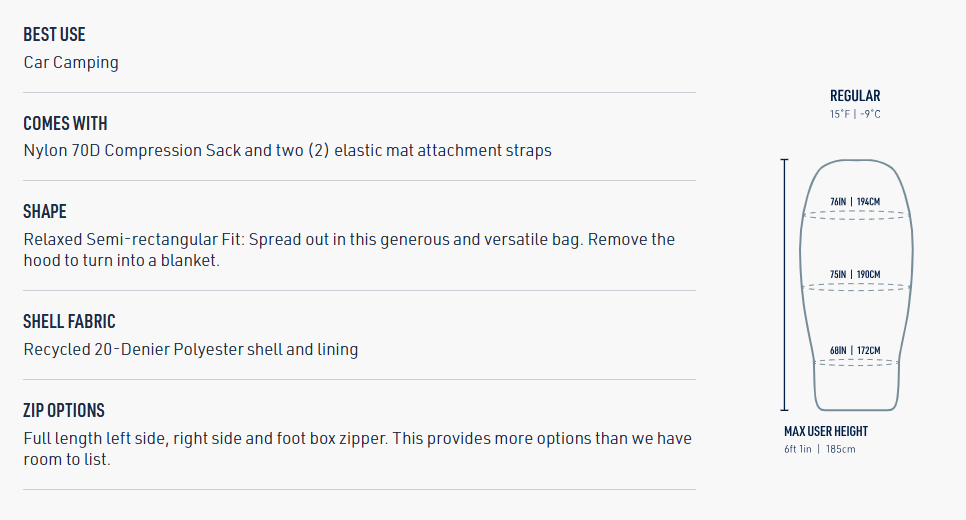 - - **RDS πιστοποιημένο, πούπουλο πάπιας 650+ fillpower με επεξεργασία Ultra-Dry Down χωρίς PFC** για να παραμένει πιο στεγνό σε υγρές συνθήκες - **Περιλαμβάνει ένα ελαφρύ κέλυφος 20D ανακυκλωμένου νάιλον**, με επικάλυψη DWR χωρίς PFC για προστασία από τον άνεμο και την υγρασία και μια επένδυση 20D ανακυκλωμένου νάιλον για μεγαλύτερη άνεση - **Το σύστημα Free-Flow+ Zip** προσφέρει εξαιρετική ρύθμιση της θερμοκρασίας και πολλές ρυθμίσεις του υπνόσακου - **Υπερμεγέθη κουκούλα με κορδόνια ρύθμισης** που προσφέρει χώρο για το αγαπημένο σας μαξιλάρι από το σπίτι